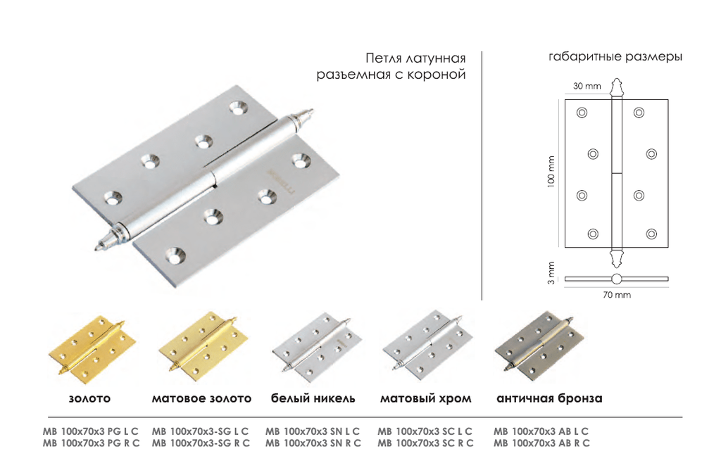 Петля карточная MORELLI MB SN L C 100х70мм белый никель - купить в интернет-магазине Орегон с доставкой в регионы Крыма.
