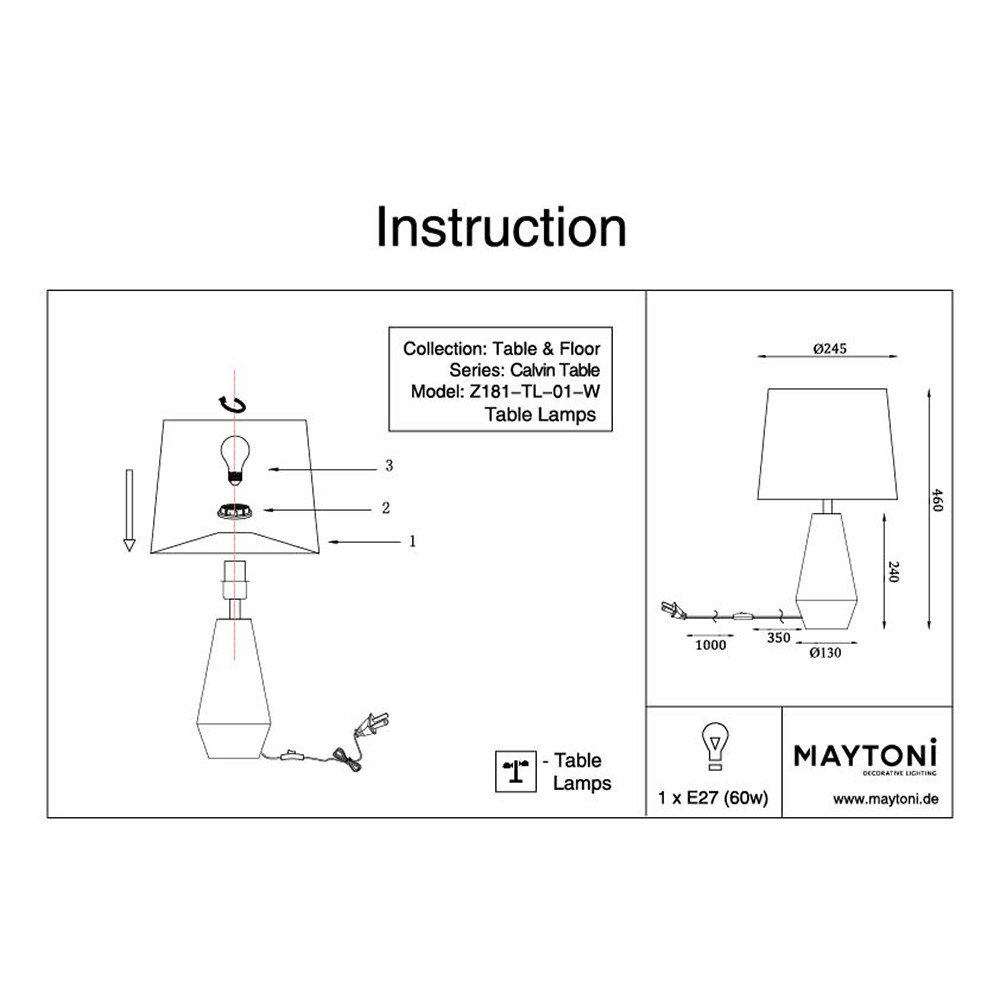 Настольная лампа Maytoni Calvin Table Z181-TL-01-W 60Вт E27 - купить в интернет-магазине Орегон с доставкой в регионы Крыма.
