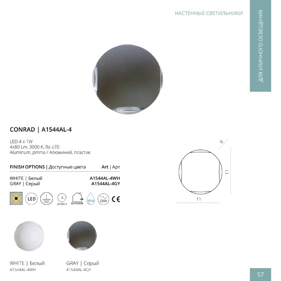 Светильник фасадный Arte Lamp CONRAD A1544AL-4GY 1Вт IP54 LED серый - купить в интернет-магазине Орегон с доставкой в регионы Крыма.