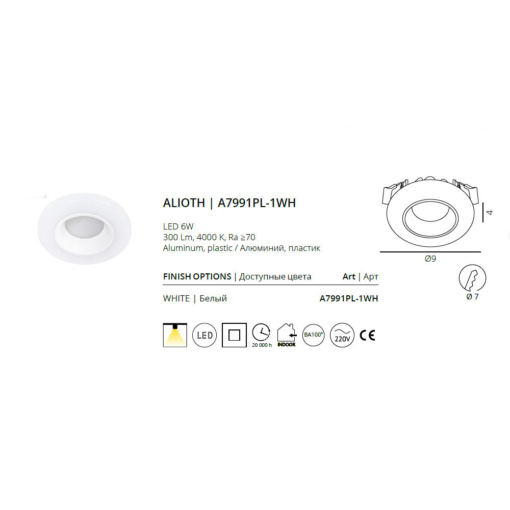 Светильник точечный встраиваемый Arte Lamp ALIOTH A7991PL-1WH 6Вт LED - купить в интернет-магазине Орегон с доставкой в регионы Крыма.