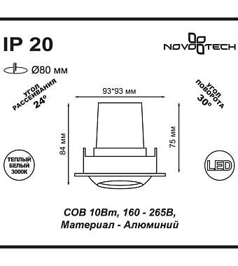 Светильник точечный встраиваемый Novotech SPOT 357696 10Вт LED - купить в интернет-магазине Орегон с доставкой в регионы Крыма.
