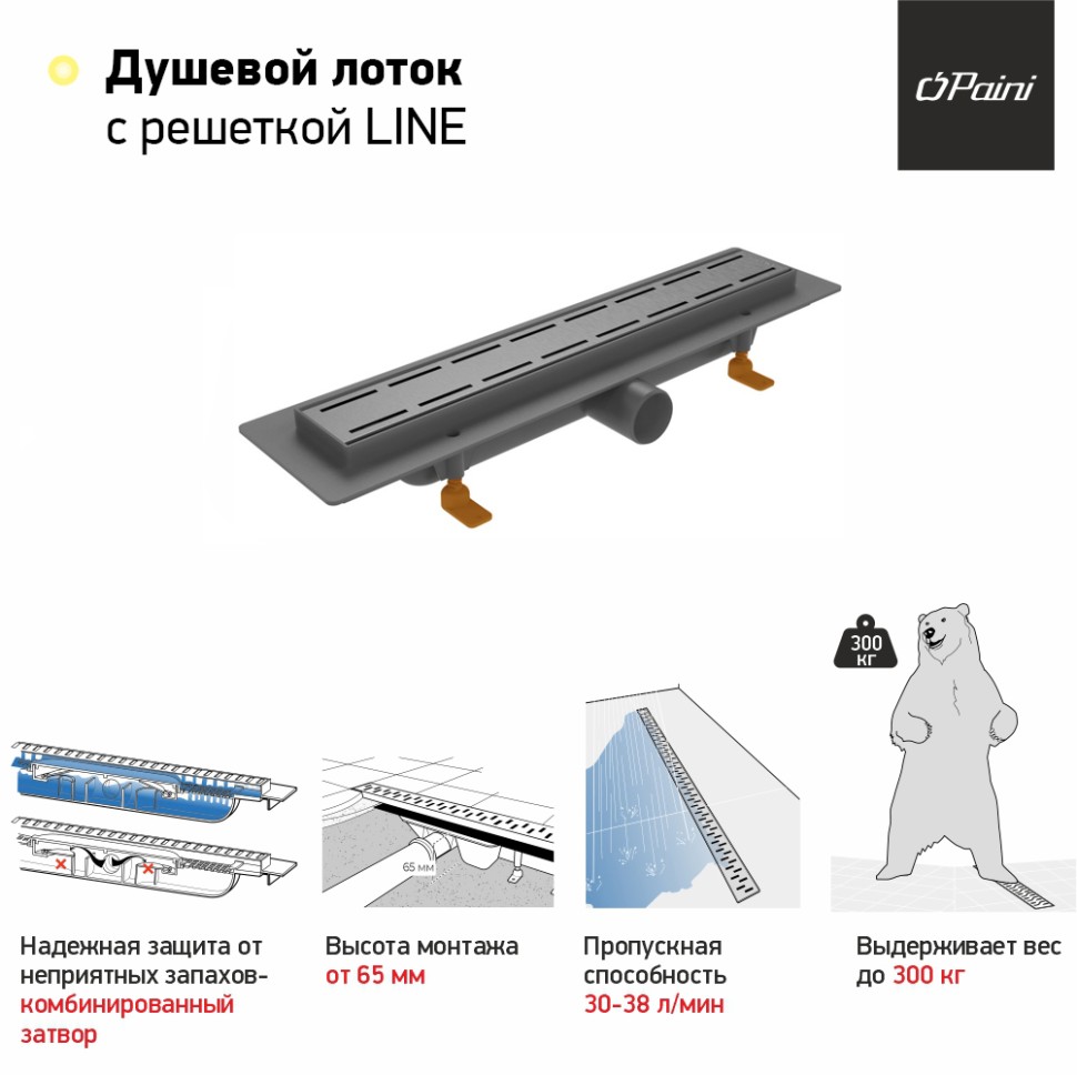 Линейный трап Paini Line CH550LC позволяет реализовать идею общего пространства "ванной без барьеров". Устройство монтируется непосредственно в пол и является прекрасной альтернативой поддону. Душевой уголок оформленный таким образом смотрится просторно, воздушно и стильно, может быть оборудован в любом месте и не привязан к форме и размерам поддона. Лоток обеспечивает слив воды со скоростью 38л\мин, собирает мусор, не давая ему закупоривать сливные каналы, а комбинированный затвор защищает ванную комнату от неприятного запаха из канализации. Трап поставляется с решёткой и опорами . Страна производителя: Чехия. Вы можете купить Душевой лоток Paini CH550LC 55х55см горизонтальный сток с решёткой и опорами в интернет-магазине "ОРЕГОН" с бесплатной доставкой по всему Крыму или забрать товар самостоятельно в любом из наших магазинов в Ялте, Севастополе и Симферополе.
