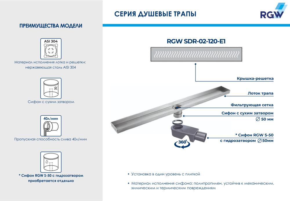 Душевой лоток RGW 21210212-01 SDR-02-120-E1 120х9см горизонтальный сток с решёткой - купить в интернет-магазине Орегон с доставкой в регионы Крыма.