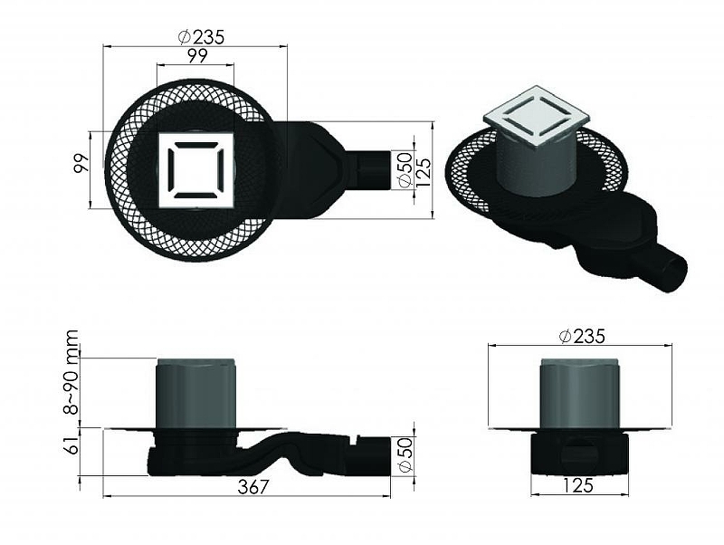 Душевой трап BERGES 090158 100х100 36,7х23,5см горизонтальный сток