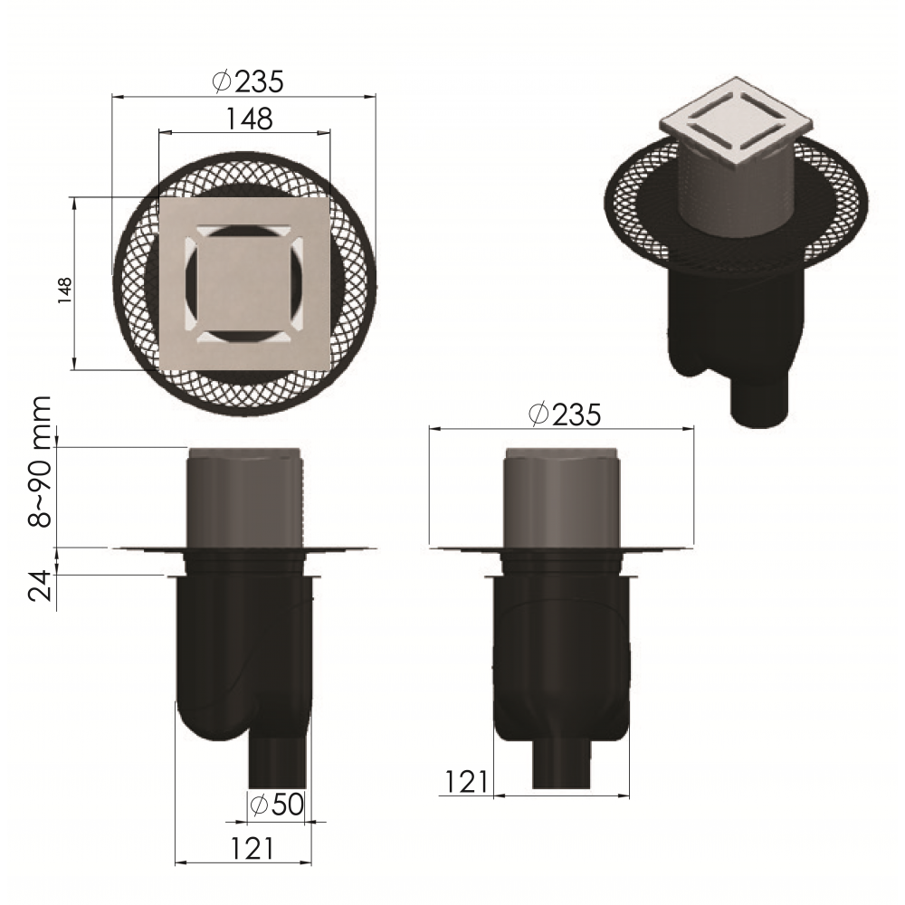 Душевой трап BERGES 092059 150x150 23,5х23,5см вертикальный сток