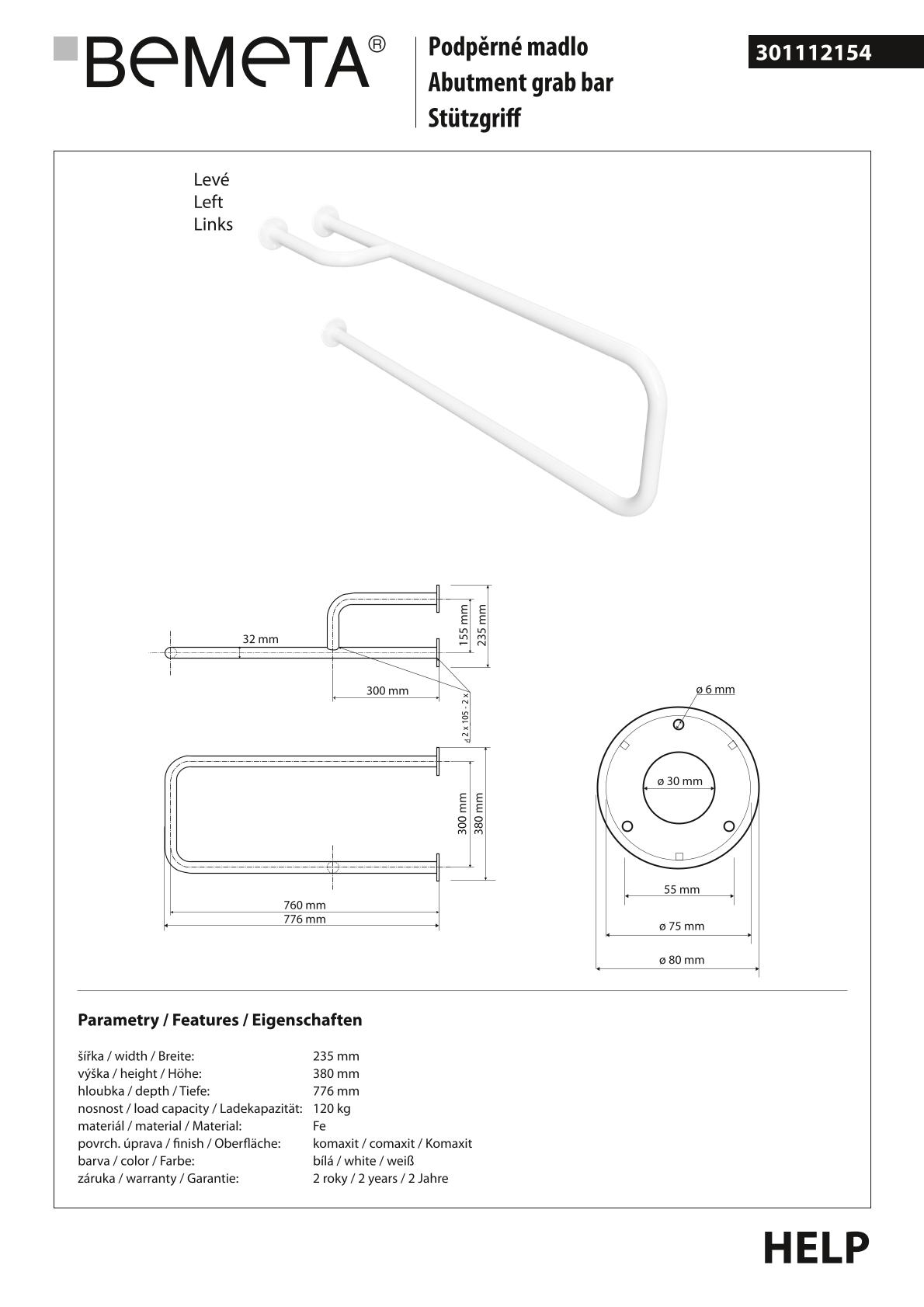 Поручень для ванной BEMETA HELP program 301112154 77,6см белый