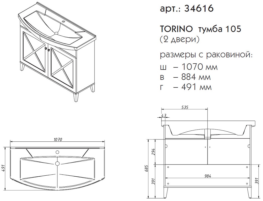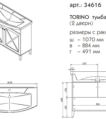 Тумба под раковину напольная CAPRIGO TORINO 34616-TP811 49х90,1х107см - купить в интернет-магазине Орегон с доставкой в регионы Крыма.
