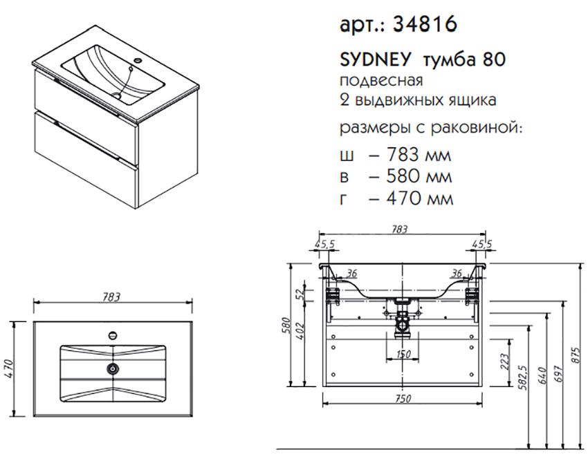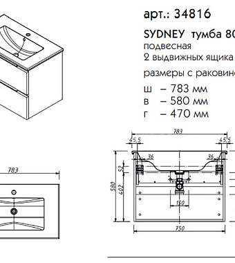 Тумба с раковиной CAPRIGO SYDNEY 34816-В231 47х78,3х58см - купить в интернет-магазине Орегон с доставкой в регионы Крыма.