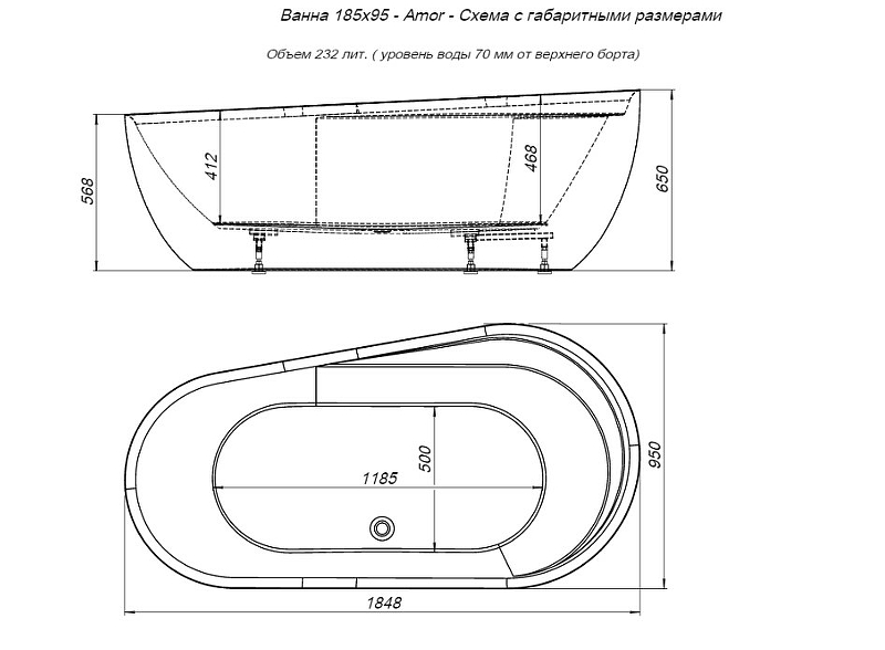 Ванна акриловая AQUANET Amor 301379 185х95см отдельностоящая