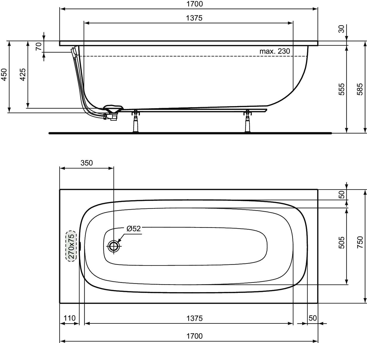 Ванна акриловая IDEAL STANDARD i.life T476001 170х75см встраиваемая