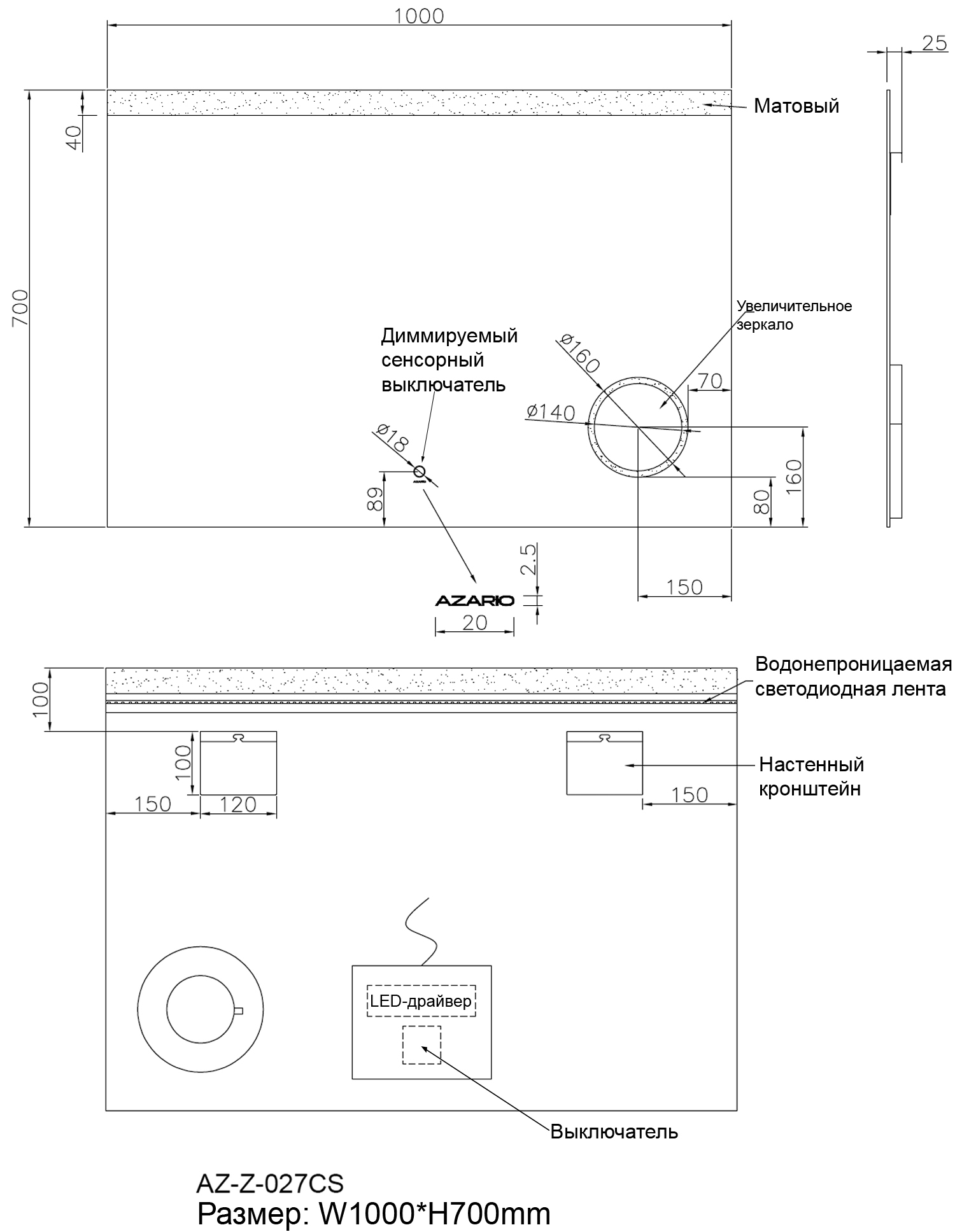 Зеркало Azario AZ-Z-027CS 70х100см с подсветкой - купить в интернет-магазине Орегон с доставкой в регионы Крыма.